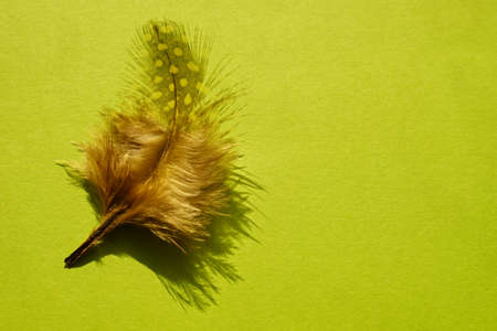 background of brightly colored dyed bird feathers on Colored background, top view. copyspace.