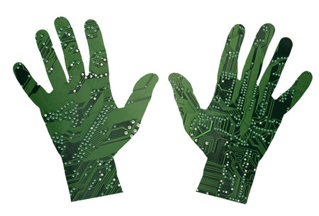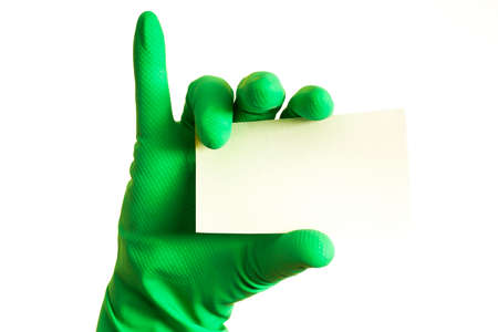 Hand in green glove holding a sticky note with space for text, on white background, isolated