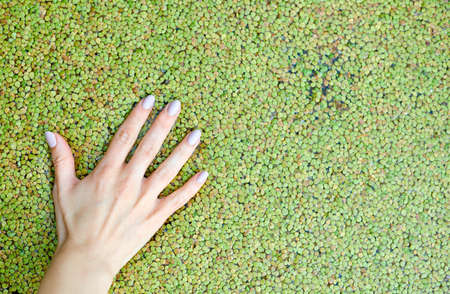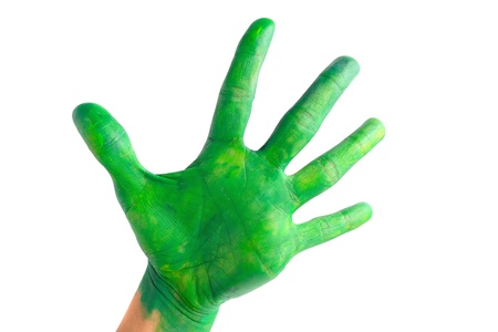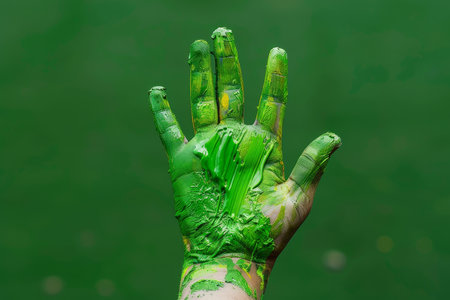 Closeup shot of a hand covered in wet green paint with green backdrop