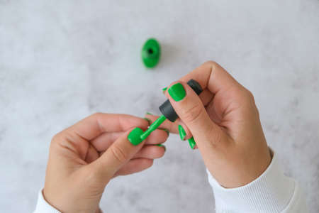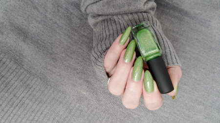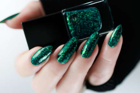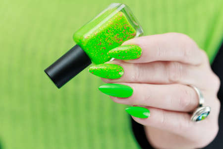 Female hand with long nails and a green manicure holds a bottle of nail polish