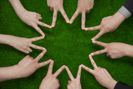 Women and men friends make star shape from fingers. Success, friendship concept.
