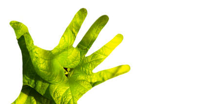 A man's hand in green tree leaves on a white background. The leaves of the plant in the person's hand. Isolated. Close-up. Conceptual: environmental protection, protect nature. Man and nature.