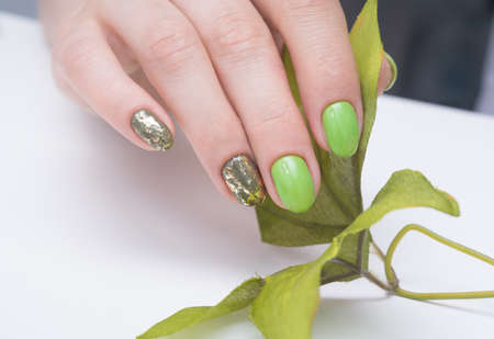 Female hand with green nail design. Green nail polish manicure. Female hand on a tropical plant leaf background