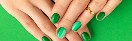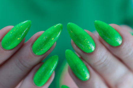 Woman's hands with long nails and a green manicure holds a bottle of nail polish