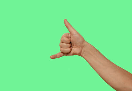 male hand on mint background showing the symbol of victory or number two or sexual insult