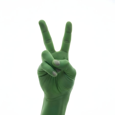 A hand painted green forms the peace symbol, with two fingers extended upwards against a stark white backdrop.