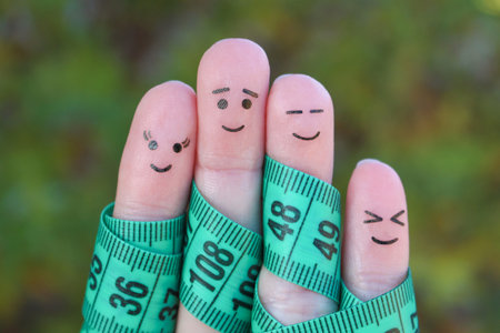 Fingers art of a Happy family with tape measure. Concept of losing weight together
