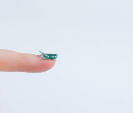 Damaged female nail with green manicure. Peeled off gel polish with nails. Home manicure concept.