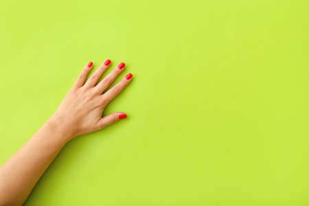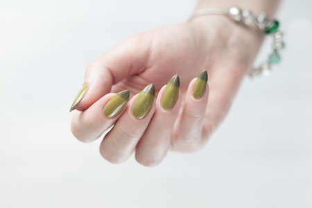 Manicured female hands with stylish green nails. Trendy modern design manicure. Gel nails. Skin care. Beauty treatment. Nail care. Wellness. Trendy colors.