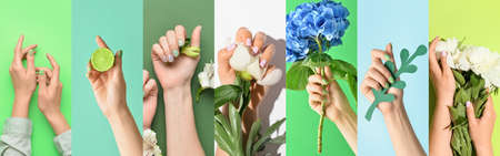 Beautiful womans hands with summer nail on green succulent background. Fresh manicure isolated on white background near green flowerpot succulent.