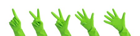Hand with green rubber protection glove isolated on white banner (one 1, two 2, three 3, four 4, five 5). Gloves cleaning, kitchen gloves.