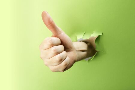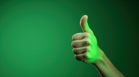 Thumbs up sign hand gesture on green screen. Simbol of approval like positive emotion. Closeup