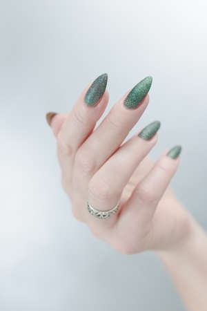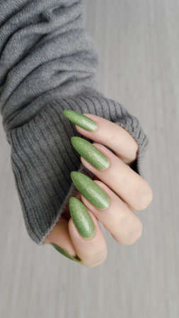 Female hand in gray knitted sweater with beautiful manicure - green glittered nails. Nail care concept