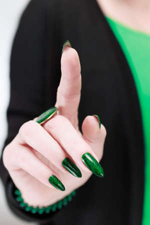 Woman's hand with long nails and light and dark green manicure with bottles of nail polish