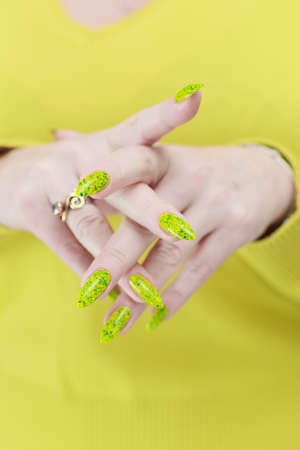 Woman's hand with long nails and bright green manicure with bottles of nail polish