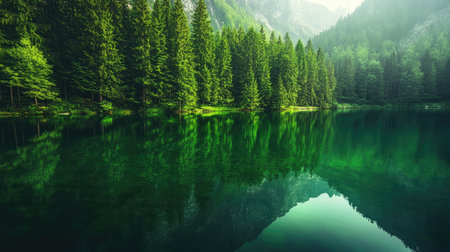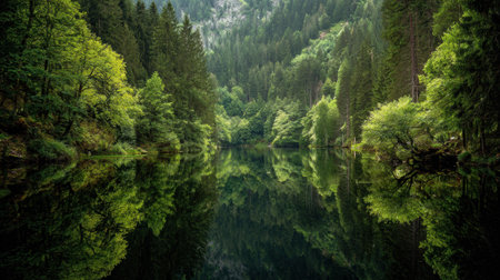 A serene landscape features a calm lake reflecting a dense forest of evergreen trees. The water mirrors the green foliage, creating a symmetrical composition. The image showcases a natural environment. Suitable for editorial and commercial applications, it evokes a sense of peace and tranquility.
