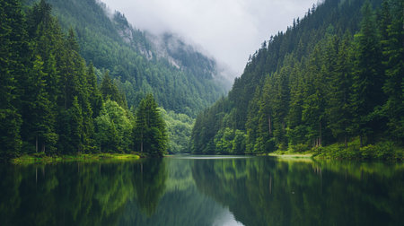 A serene lake reflecting misty forest, evoking tranquility and environmental preservation