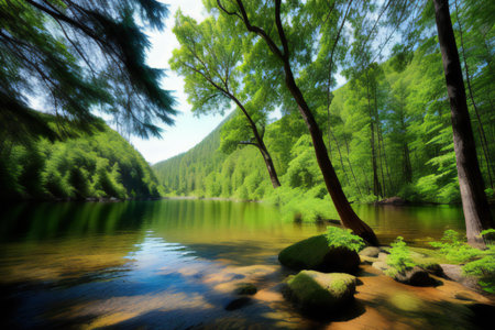 a photo of a treelined river in the forest, showcasing a captivating blend of dark emerald and light azure hues. the image captures the serene simplicity and rustic charm of the swiss style, with reflections and mirroring adding a touch of hazy romanticism. this enchanting scene exudes a forestpunk vibe, inviting viewers to immerse themselves in its natural beauty. ai generated