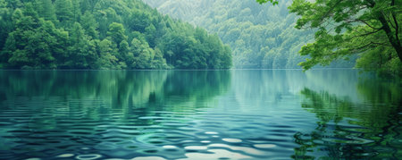 Peaceful lake background with calm water, green trees, and textured reflections. The serene, natural scene creates a tranquil, picturesque atmosphere, perfect for nature or wellness themes