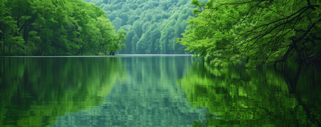 Immerse yourself in serene nature with this image showcasing dynamic emerald reflections on calm water Lush green foliage surrounds the tranquil lake, creating a peaceful scene of renewal and harmony Perfect for wallpaper or nature projects, this captivating vista invites contemplation of the connection between forests and water AI Generative