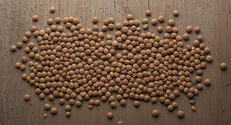 A pile of brown lentils is scattered across a rustic wooden surface, viewed from directly above.