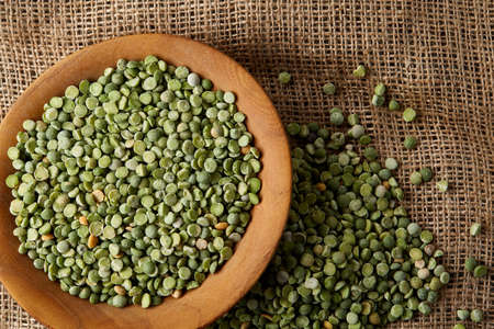 Raw green peas on a wooden plate over burlap tablecloth, close-up, selective focus, top view. Some copy space for your inscription. Studio shot. Macro. Nutritious organic protein. Healthy food concept. Healthy eating, dieting.