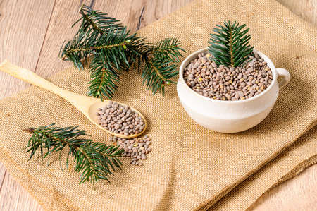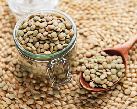 Dry Raw Organic Green Lentils on a Spoon for Cooking