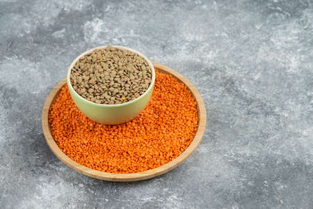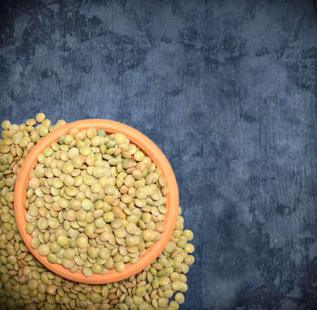 raw lentils (Lens culinaris) in a clay bowl. Top view