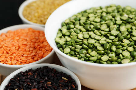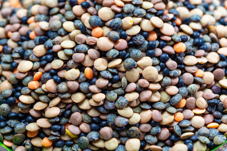 Colorful mix of lentils legumes ready for cooking, tasty vegetarian food commonly used in South Asian cuisine close up