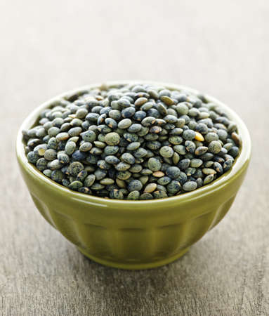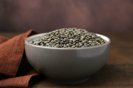 Green lentils in wooden bowl on wood background. Edible raw pulses of the legume family.