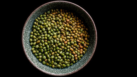 An artistic overhead view of green mung beans in a decorative bowl, showcasing the vibrant colors and textures, perfect for food styling and healthy cooking.