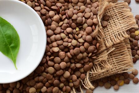 lentil grains poured out of a canvas bag on the table. high quality photo