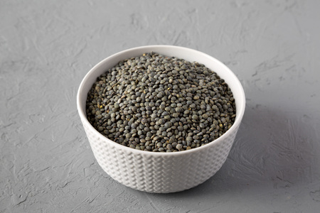 Dry green french lentils in gray bowl over concrete background, side view. Close-up.