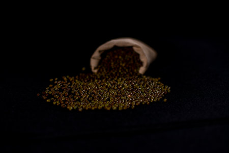Many dried okra seeds in wooden spoon, on bamboo cutting board