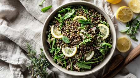 A top-down view of a refreshing lentil salad, artfully arranged with herbs and lemon slices. The flat presentation on a linen surface adds a rustic charm, enticing anyone to enjoy this wholesome dish.