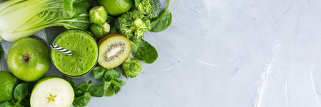 Food and drink, healthy dieting and nutrition, lifestyle, vegan, alkaline, vegetarian concept. Green smoothie with organic ingredients, vegetables on a modern kitchen table. Copy space background