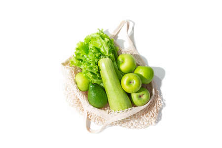 Fresh green fruits and vegetables in eco string bag isolated on white background. Top view of salad, zucchini, apples and avocado. Ingredients for color diet. Healthy food concept.