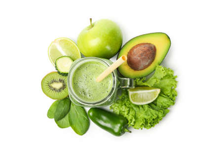 Green vegetables, fruits and jar of smoothie isolated on white background