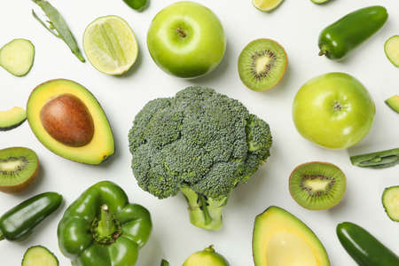 Close up of green vegetables and fruits on white background. Healthy eating and food for vegans. Behind the scenes