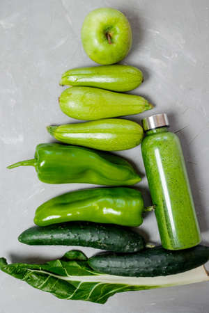 Green vegetables and smoothies in a plastic bottle on a gray background. Healthy christmas tree concept. Top view