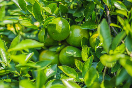 Citrus reticulata tree, full of fruits, tangerines, still small, with green leaves, at the end of summer in an orchard near Madrid
