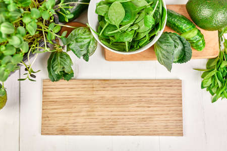 Frame of raw green vegetables and herbs for vegetarian protein diet