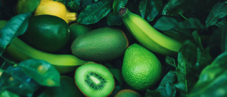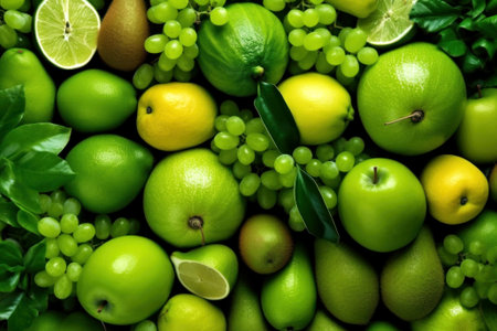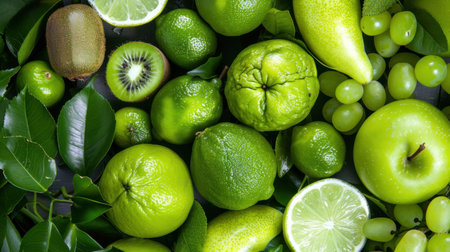 A vibrant display of green fruits and leaves featuring limes, lemons, kiwis, and green grapes. Perfect for health, nutrition, and freshness representations.
