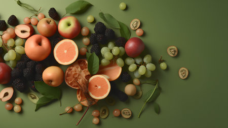 Assortment of different fruits and berries, flat lay on green background. Generative Ai
