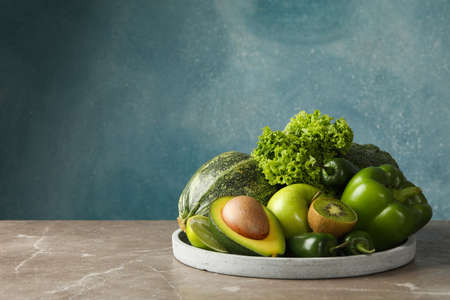Tray with green fruits and vegetables on gray table