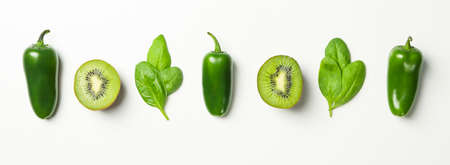 Kiwi, spinach and pepper on white background