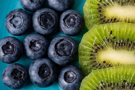 Creative healthy food photo of berries and kiwi on plate with nature-inspired layout