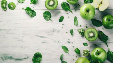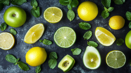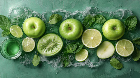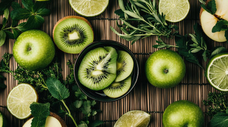 A vibrant display of healthy green fruits, featuring slices of kiwi, lime, and green apples, arranged artistically with fresh herbs. Perfect for healthy lifestyle themes.