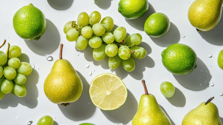 A vibrant arrangement of fresh green fruits including grapes, limes, and pears on a light background, perfect for healthy eating and seasonal inspirations.