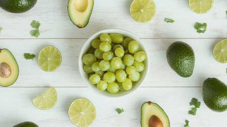 A top view of a bowl filled with fresh green grapes surrounded by avocados and lime wedges, creating a vibrant and healthy food arrangement perfect for summer.